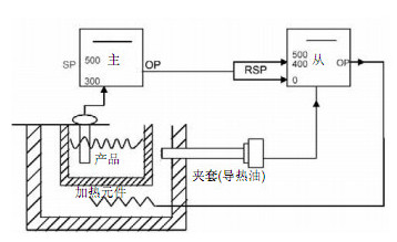 对于存在两个或多个容器缓冲的控制对象(举例:通过夹套间接加热),使用单个仪表来控制就显得比较困难,经常出现超调和滞后的问题,这时最好的解决方案就是使用串级控制,将2个或多个控制器串联起来,各自监控不同的过程变量,形成一个整体。产品的设定点温度被设置在主控制器上,将这个设定温度与产品的实际温度对照,形成主控制器的PID输出(mA或VDC)作为从站的远程设定点使用。这个远程设定点(RSP,外给定),可以根据需要任意标定。理想状态下,从控回路的响应时间应至少比主控回路快5倍。